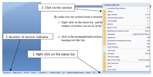 1. Right click on the status bar and then on section. This will show you the number of section you are in, in the status bar. Like this:-